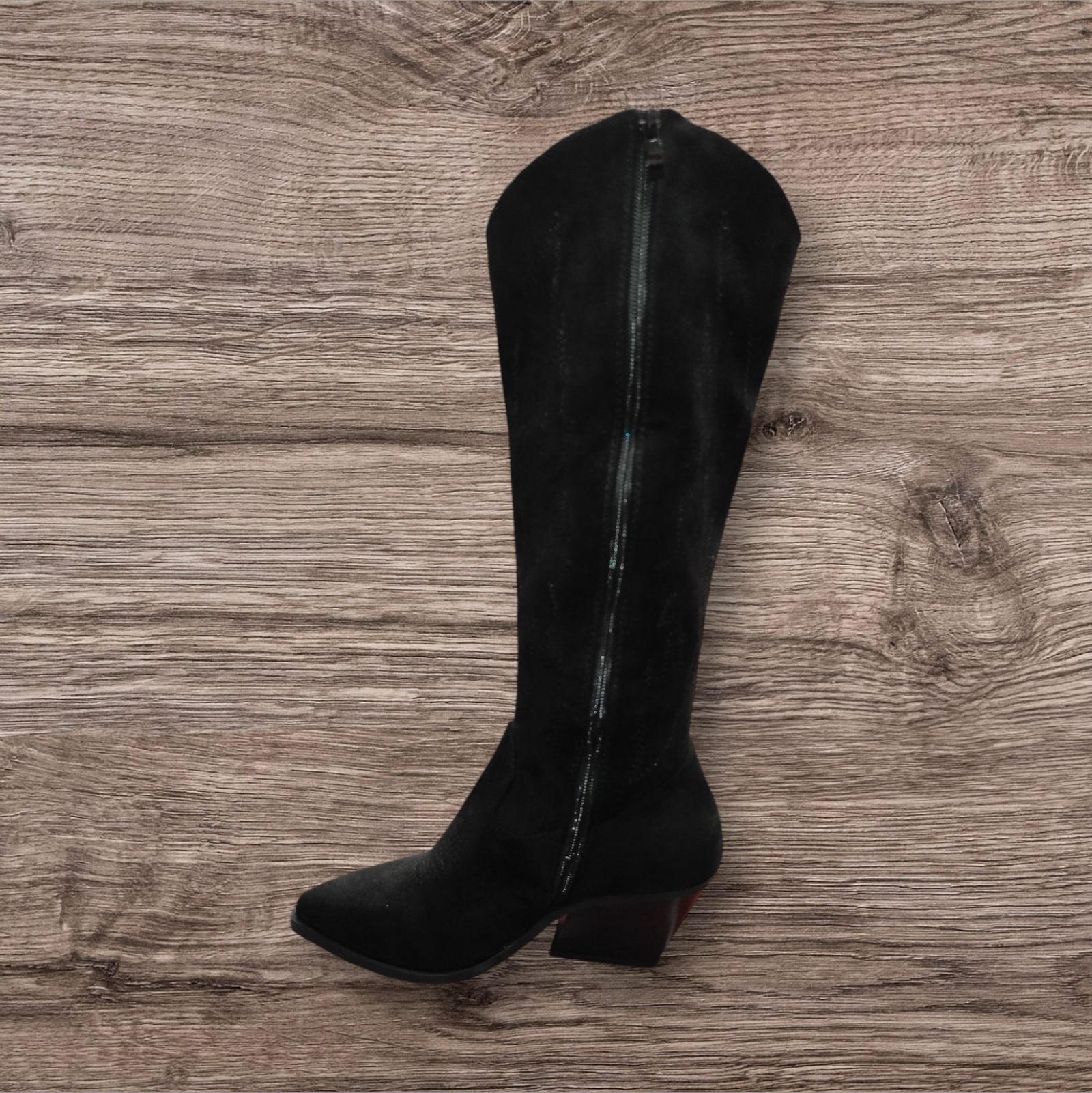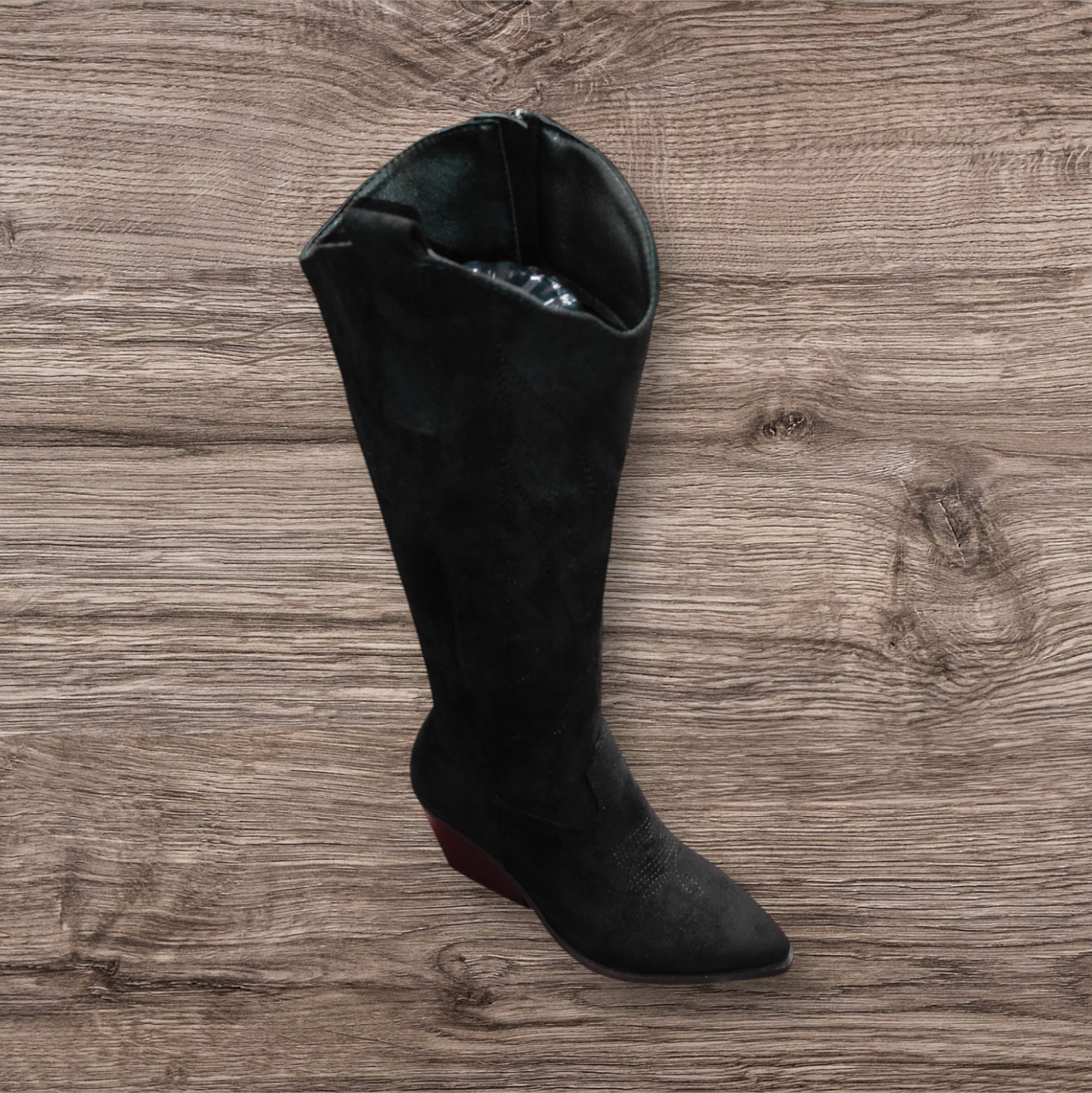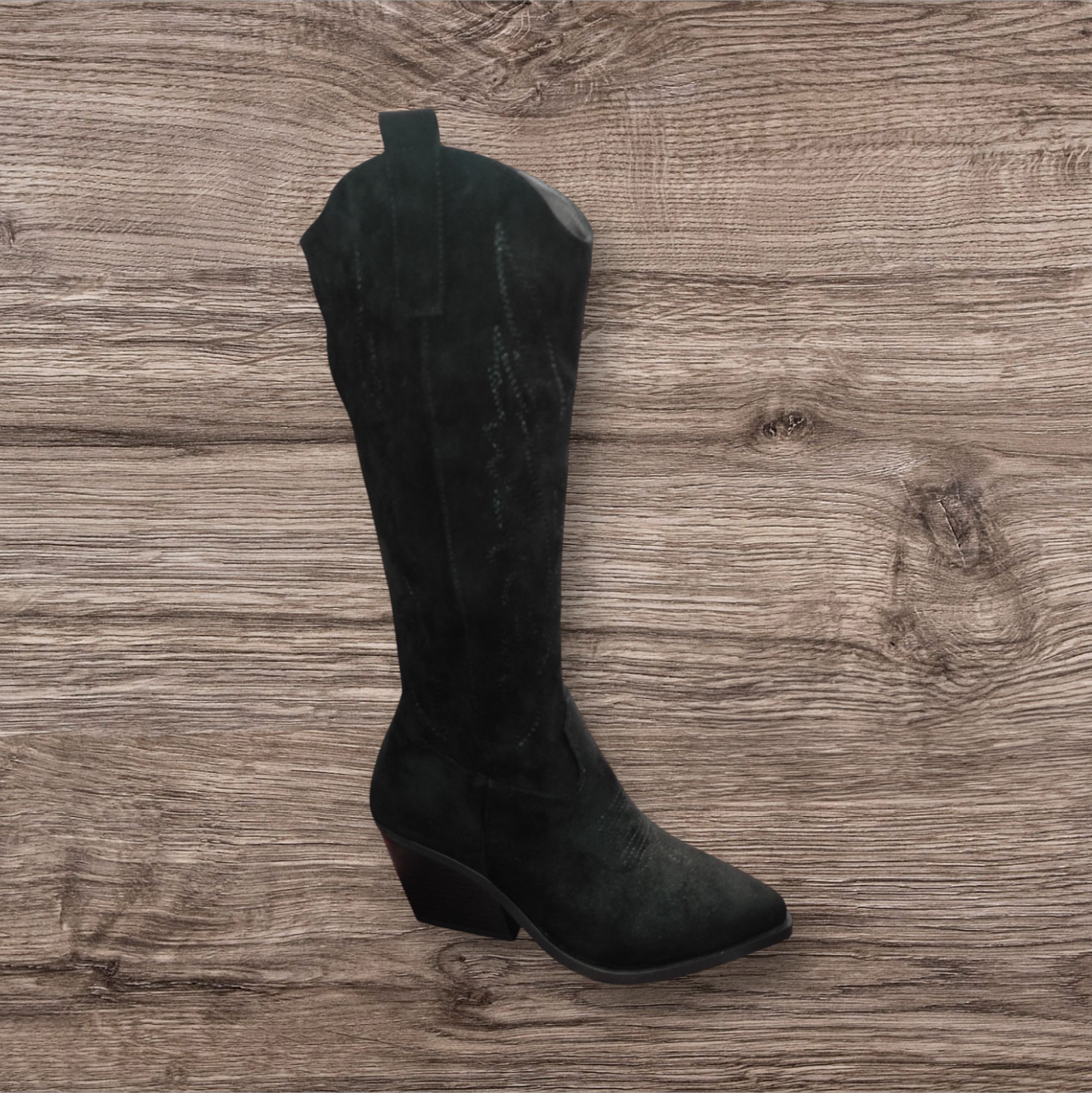 ELEVA TU LOOK CON ESTAS BOTAS ALTAS DE INSPIRACION WESTERN.CONFECCIONADAS EN MATERIAL TIPO GAMUZA DE ALTA CALIDAD,OFRECEN UN ACABADO SOFISTICADO Y SUAVE AL TACTO.SU DISEÑO ESTILIZA LA PIERNA,MIENTRAS QUE EL TACON BAJO TIPO CUÑA BRINDA COMODIDAD Y ESTABILIDAD PARA EL USO DIARIO.